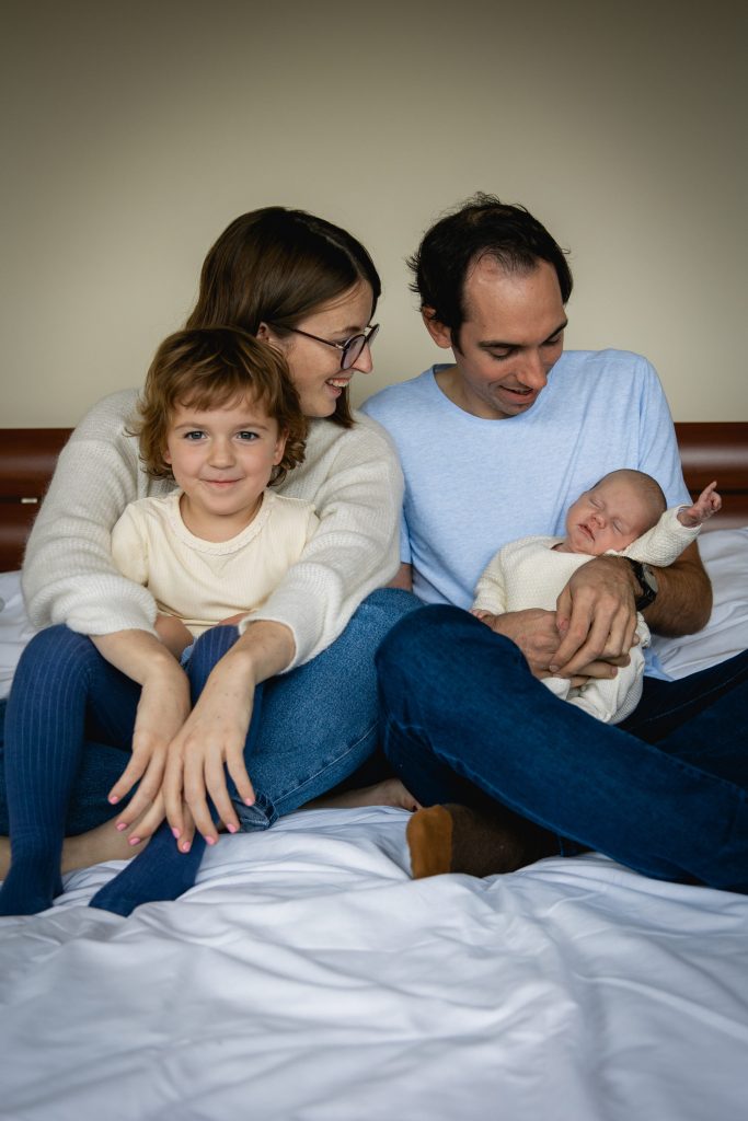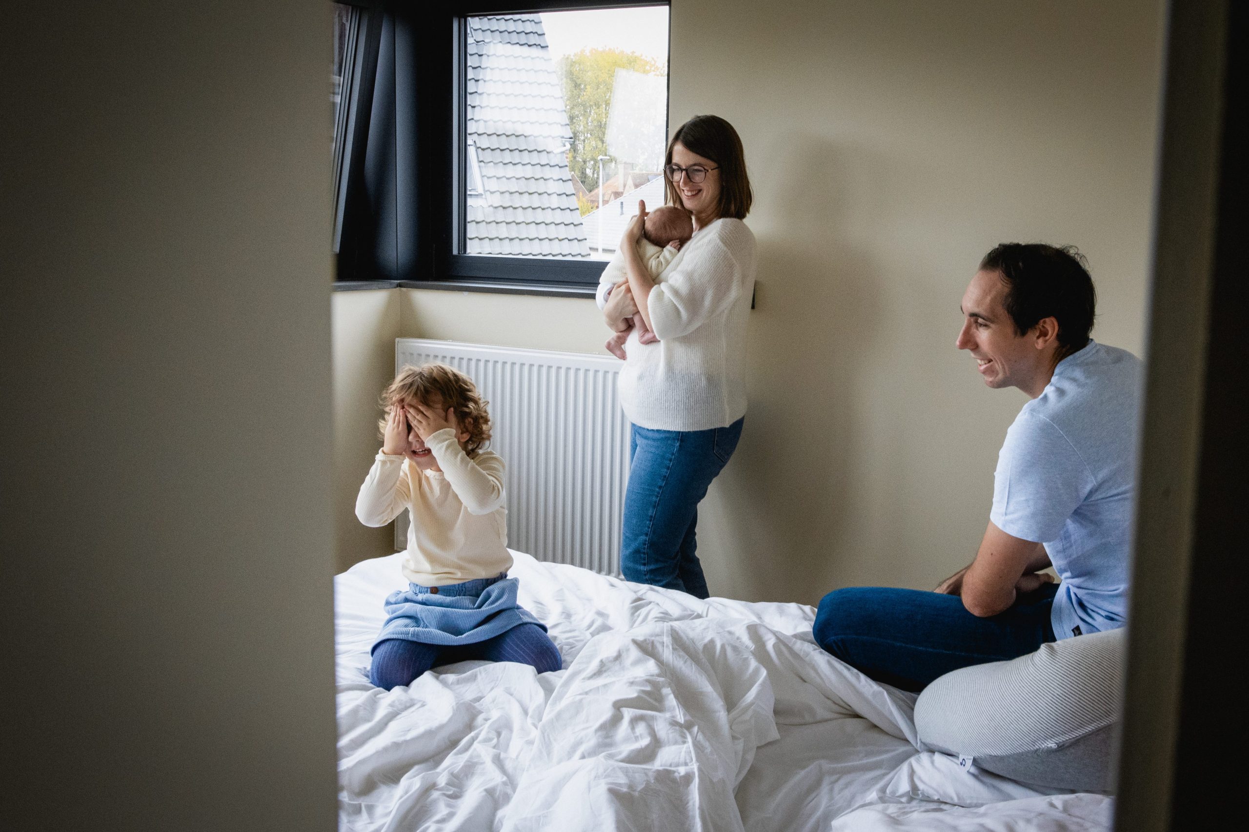 Ook dit gezin mocht ik al enkele keren in beeld brengen. Deze keer met hun pasgeboren bundeltje geluk, Feline. De tijd vliegt maar met een baby gaan die eerste weken toch net iets sneller. Behalve nachten en krampen, die kunnen vaak eindeloos lang duren. Omdat het toch steeds wat zoeken is met een pasgeborene kom ik graag aan huis. Het tempo gaat een stuk trager, van timing is weinig sprake en geen gedoe met verzorgingstassen en dutjes. Rustig genieten van elkaar. Of het entertainen van de oudere kinderen want van deze spring-in’t-veld mocht de fotojuf nog eens langskomen.