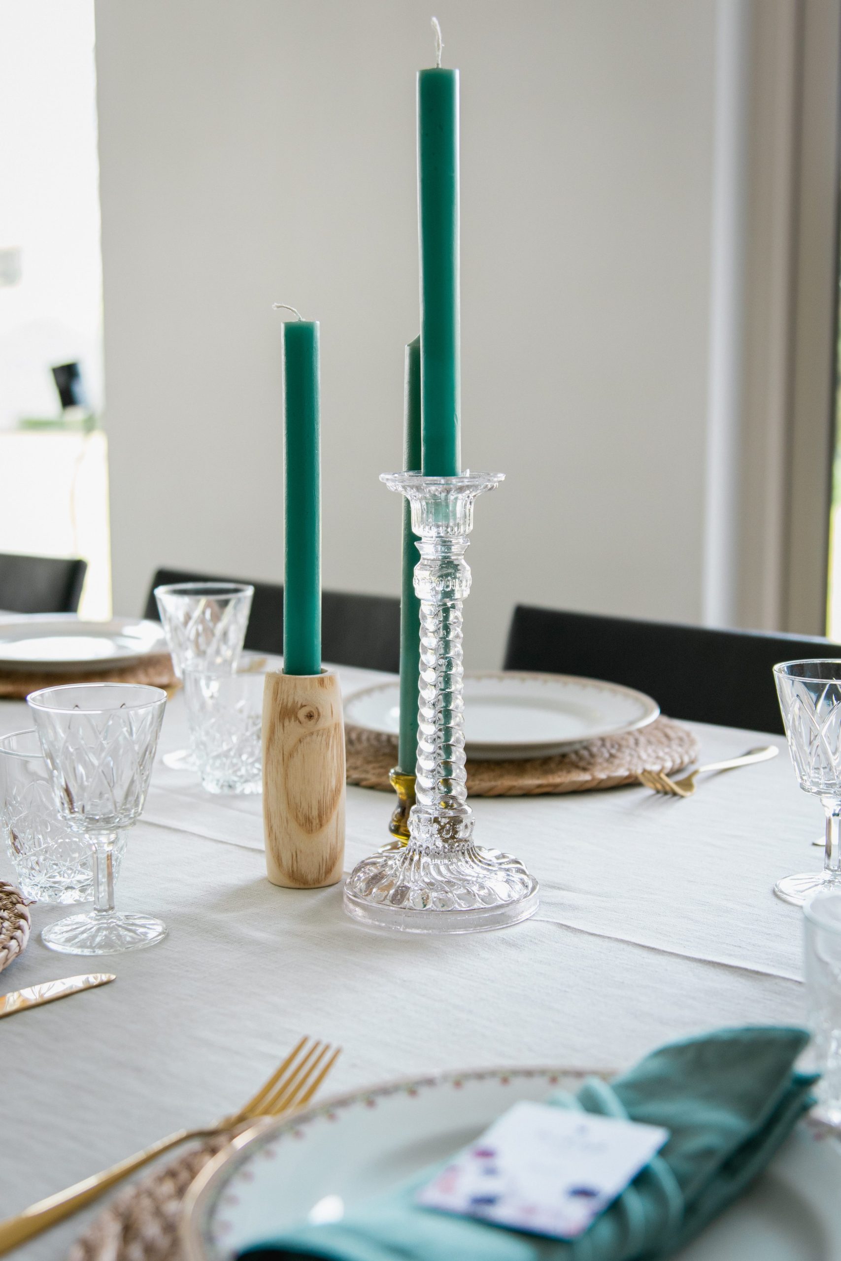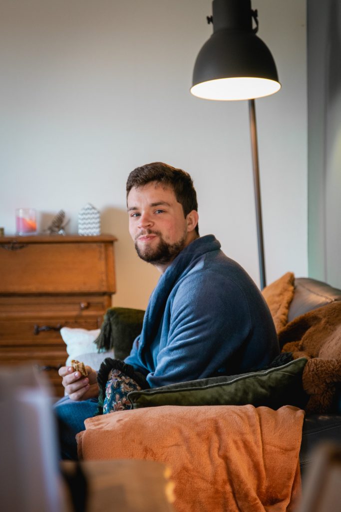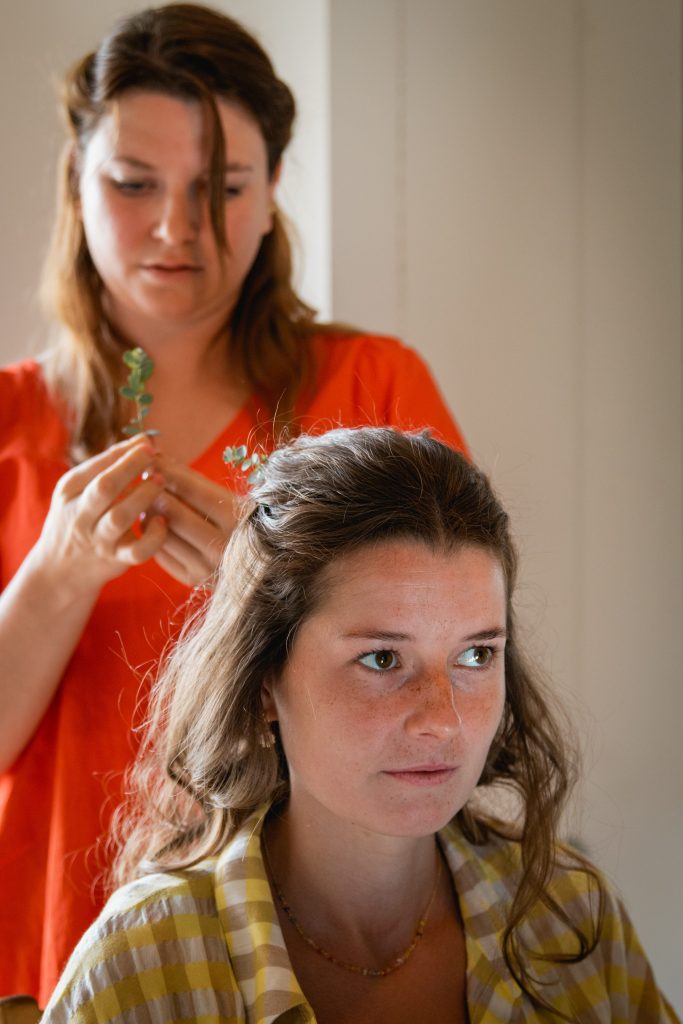 Helaas voor Jana en Arno was ik de dag van hun huwelijk reeds geboekt. Voor hen was dit echter helemaal geen probleem. Ze trokken de dag voordien al hun kleren aan. Op die manier kon ik hen fotograferen toen ze zich klaarmaakten, een first look en ook wat voorbereidingen voor het feest de dag erop. Jana en Arno zijn beide handige Harry’s en echt doe-het-zelvers. Jana verzorgde de bloemen. Arno maakte hippe houten kandelaars.